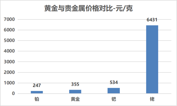 大家可别小看了这里面的催化剂,催化剂一般采用铂族金属(钯、铂、铑、钌、锇)或稀土材料制成,其中钯、铂、铑应用更为广泛,除了价格具有相对优势外,其物理性质也更稳定。但这三种金属同样价值不菲,下图展示了它们与黄金价格的差异(截至2021年3月31日金投网行情):